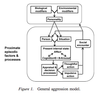 In their scholarly overview of theories concerning human aggression, DeWall, Anderson and Bushman state that aggression in modern-day people arises from a host of these biological inputs and environmental factors. Their “general aggression model” can be seen below: